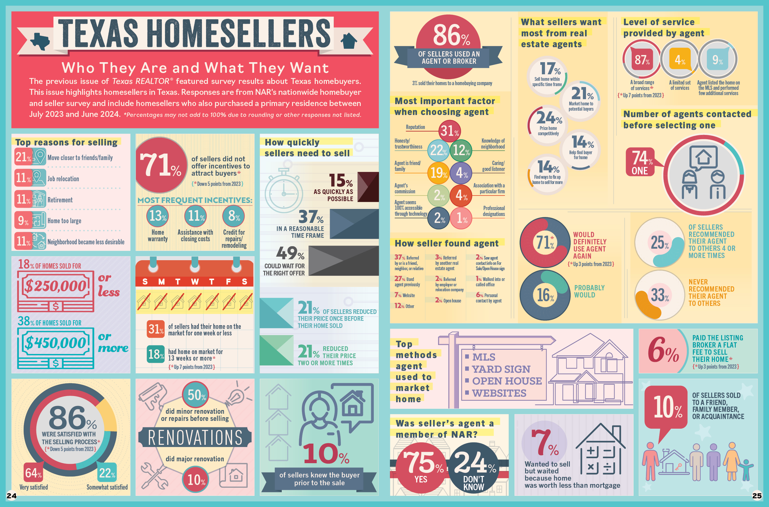 The previous issue of Texas REALTOR® featured survey results about Texas homebuyers. This issue highlights homesellers in Texas. Responses are from NAR’s nationwide homebuyer and seller survey and include homesellers who also purchased a primary residence between July 2023 and June 2024. *Percentages may not add to 100% due to rounding or other responses not listed.